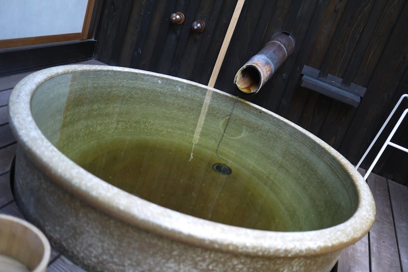 お部屋にもよるのですが、客室露天風呂がついています。源泉掛け流しで暑いので、薄めたりお湯を張っておいて時間をおいたりで調整します。とても良い部屋でした。